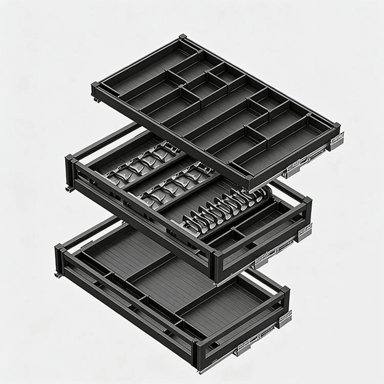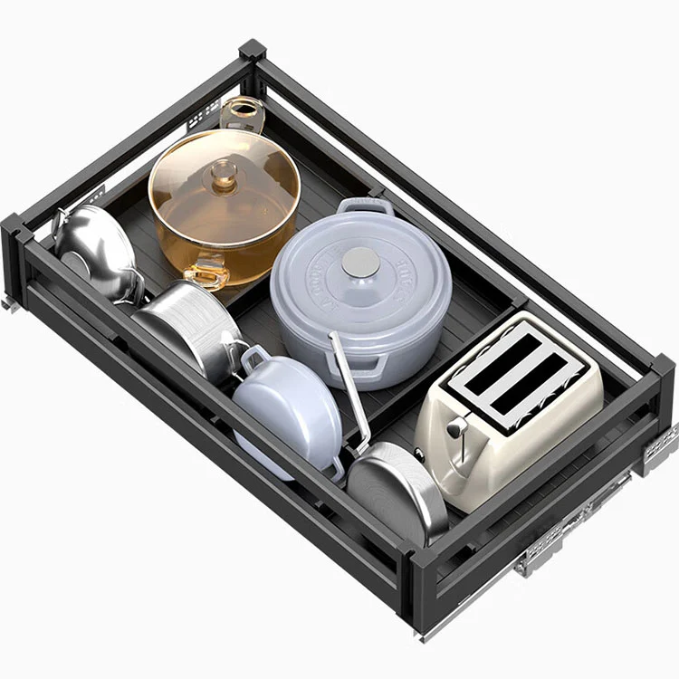 இந்த அலுமினிய அலாய் புல்-அவுட் கூடை ஒரு உட்பொதிக்கப்பட்ட சமையலறை சேமிப்பு வன்பொருள் ஆகும், இது முக்கியமாக உணவுகள், பானைகள் மற்றும் சுவையூட்டிகள் போன்ற சமையலறை பொருட்களின் வகைப்படுத்தப்பட்ட சேமிப்பிற்காக பயன்படுத்தப்படுகிறது. இந்த கிச்சன் கேபினட் டிராயர் நவீன சமையலறைகளுக்கு சிறப்பாக வடிவமைக்கப்பட்ட உட்பொதிக்கப்பட்ட சேமிப்பக தீர்வாகும். ஒரு அடுக்கு வடிவமைப்பு மற்றும் நடைமுறை செயல்பாடுகளை அதன் மையத்தில் கொண்டு, இது அலங்கோலமான உள் சேமிப்பு மற்றும் அலமாரிகளில் குறைந்த இடத்தைப் பயன்படுத்துதல் போன்ற பிரச்சனைகளை எளிதில் தீர்க்கிறது, மேலும் சமையலறை சேமிப்பிற்கு சிறந்த உதவியாளராக உள்ளது.