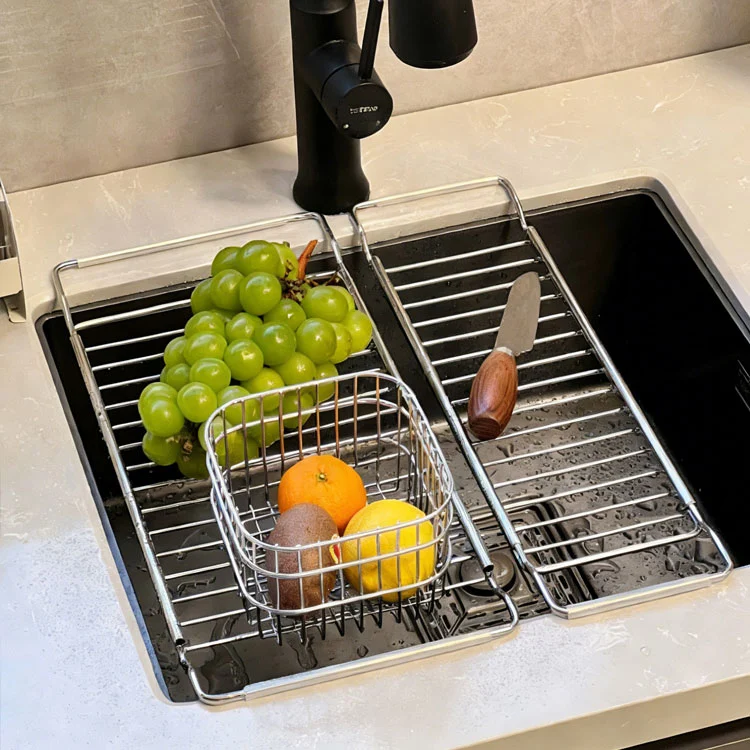 நீட்டிக்கக்கூடிய துருப்பிடிக்காத ஸ்டீல் மூழ்கும் வடிகால் ரேக்
